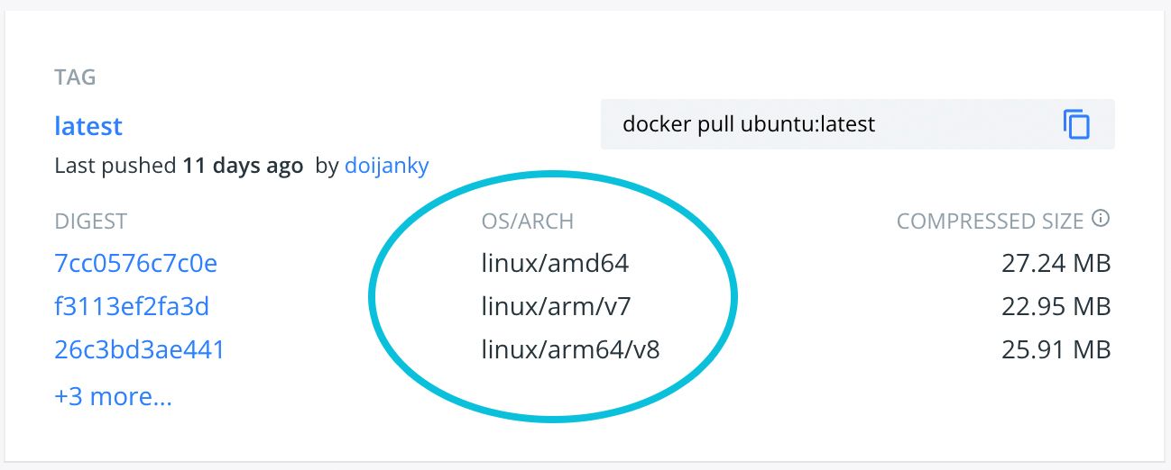 The most popular docker images tend to offer multiple builds, each targeting a different CPU architecture. The following shows the latest tag of ubuntu. As you can see, it offers builds for multiple CPU architectures: